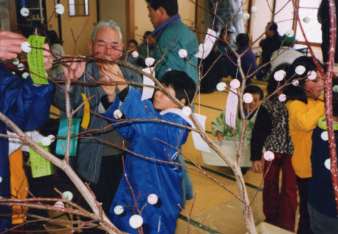 小正月の伝統行事 だんごさし が今年 もにぎやかに行われました。恒例となった この催し、おじいちゃん、おばあちゃんから 孫たちが教えてもらうというスタンスで進行 していき無病息災と願い事を短冊に書いて お祈りし、お昼はお父さんおかあさんによる お餅つきで腹ごしらえ。 名実ともに 世代交流的なお祭り です。 |